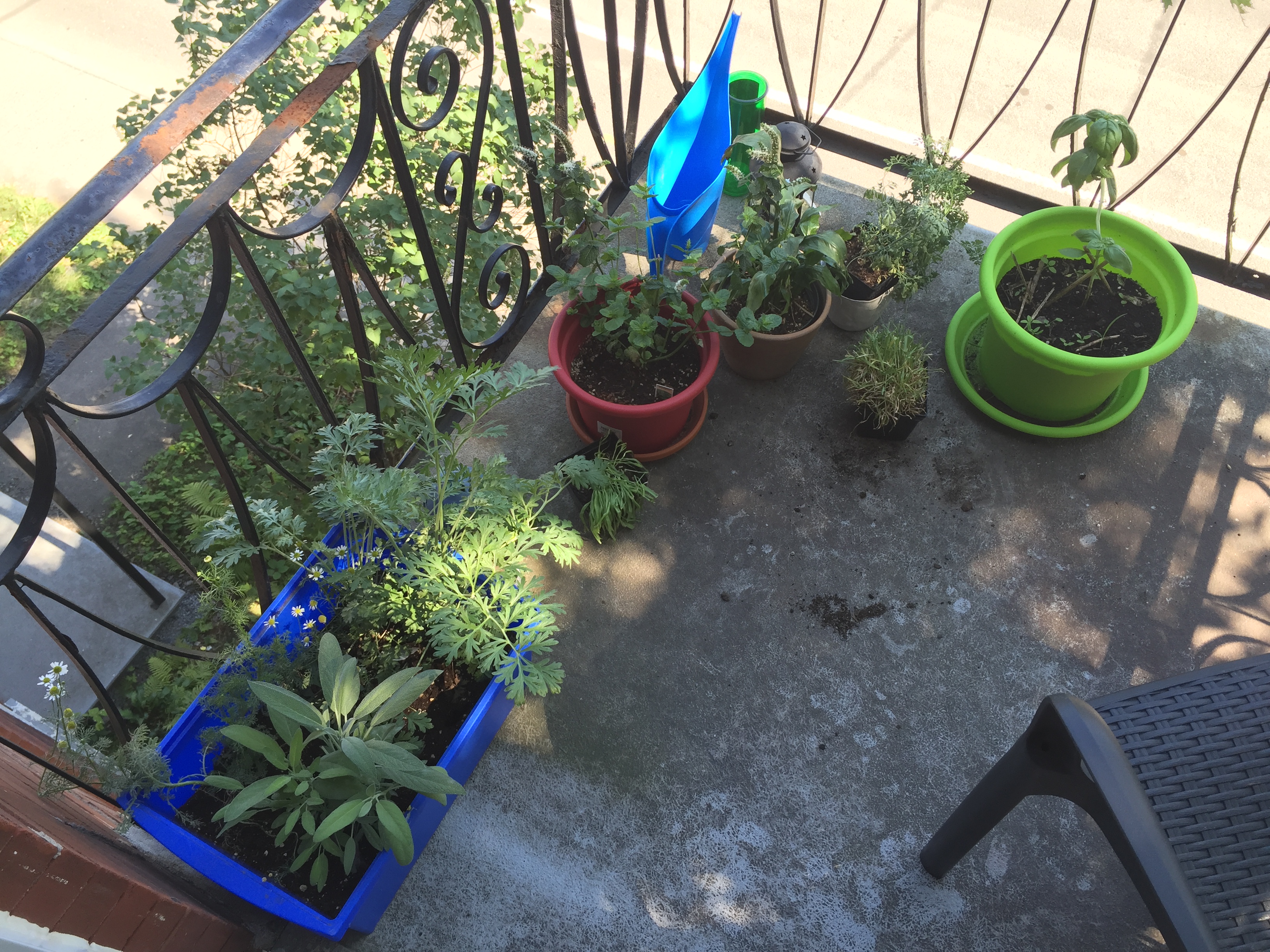 Something I've always loved being able to do is maintain a small garden, and we finally have a balcony with enough sun exposure for it to really work. I have one flower (a dormant peace lily) and the rest are all botanicals which are edible or medicinal.