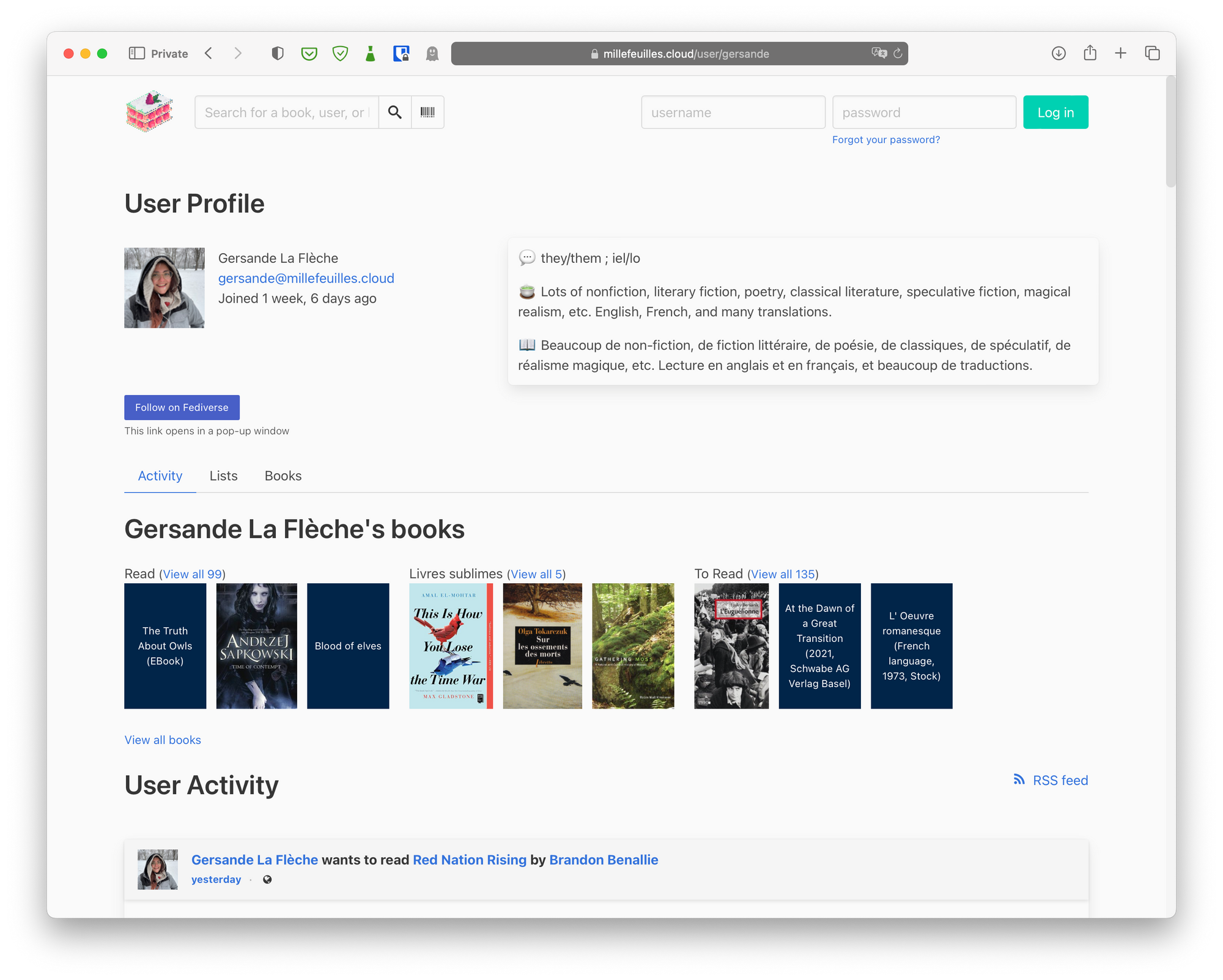 At time of writing, Millefeuilles.cloud has 8 active users (some guinea pigs old friends who agreed to embark upon this experiment with me) who have posted 467 statuses about books both locally (privately) and publicly on the Fediverse. Though there are only 8 users on Mille feuilles, they can interact with millions of other users on other Bookwyrm or Mastodon instances — if they want to! Mille feuilles also has a catalogue of over 2 502 books registered on the server, but can also import almost any book from online archives such as openlibrary.org or inventaire.io, and many more.