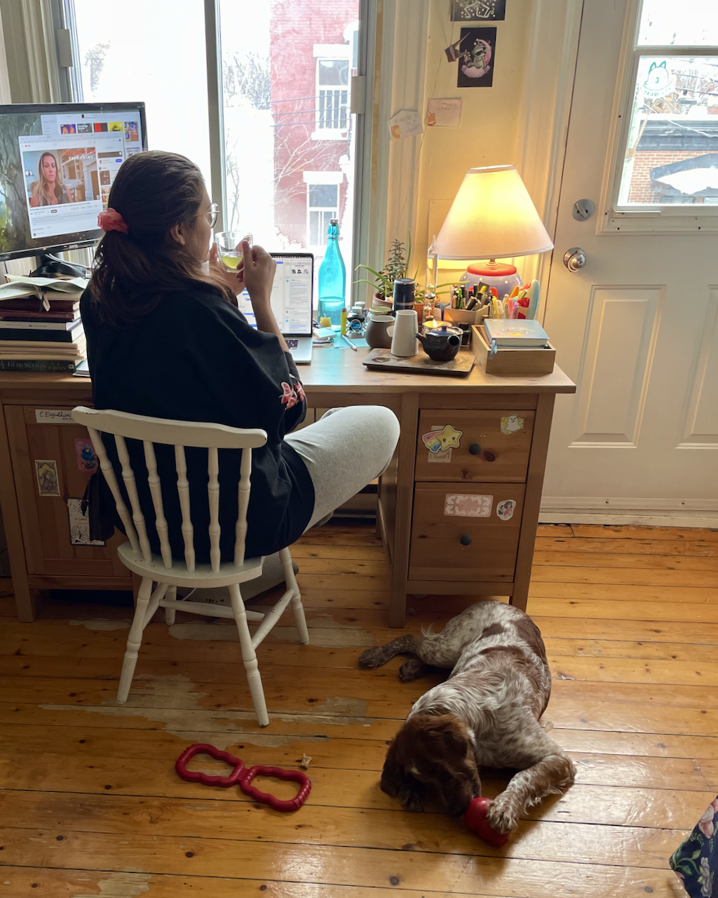 Pendant que j'étudie, Pippin me tient compagnie. Et marcher et entraîner le chiot me donne des bonnes excuses pour quitter mon bureau et me dégourdir les jambes.