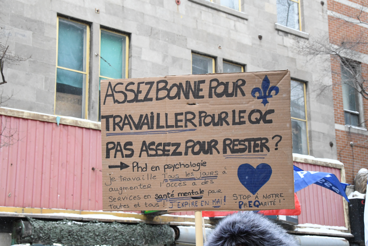 Le 7 février dernier, lors d'un froid extrême (-27 C facilement avec l'éolien), j'ai rejoint des milliers de personnes à travers le Québec qui ont marché à Montréal, Sherbrooke, Rimouski, Trois-Rivières, Québec, et Saguenay pour dénoncer la suspension sans préavis du PEQ. Le PEQ, ou Programme de l’expérience québécoise, « offrait une voie prévisible (bien que non automatique) vers la résidence permanente pour les personnes francophones travaillant au Québec depuis au moins deux ans ou ayant obtenu un diplôme québécois » (source: lacsq.org).