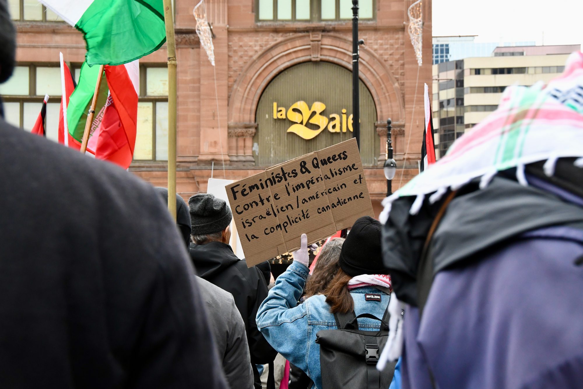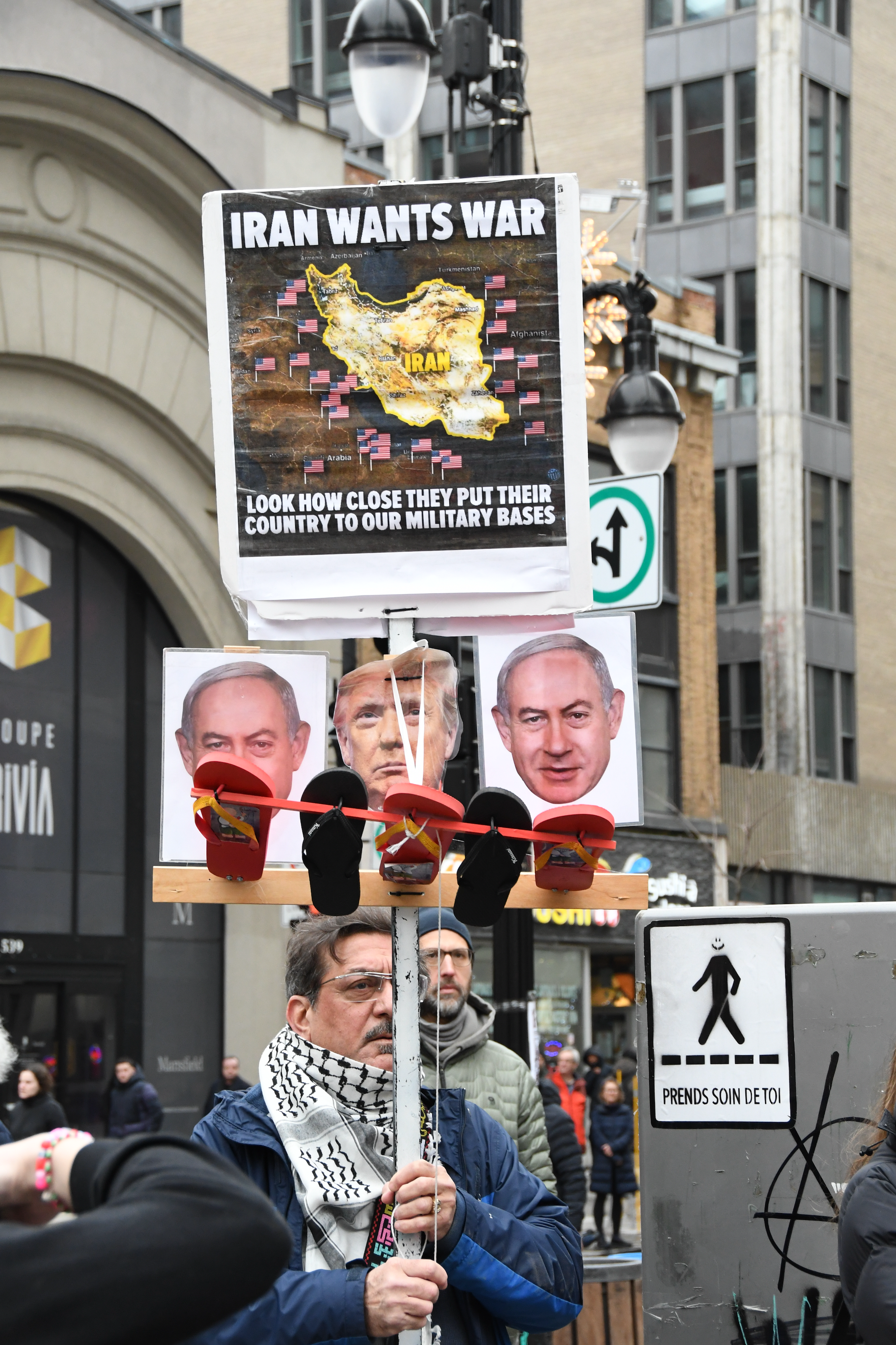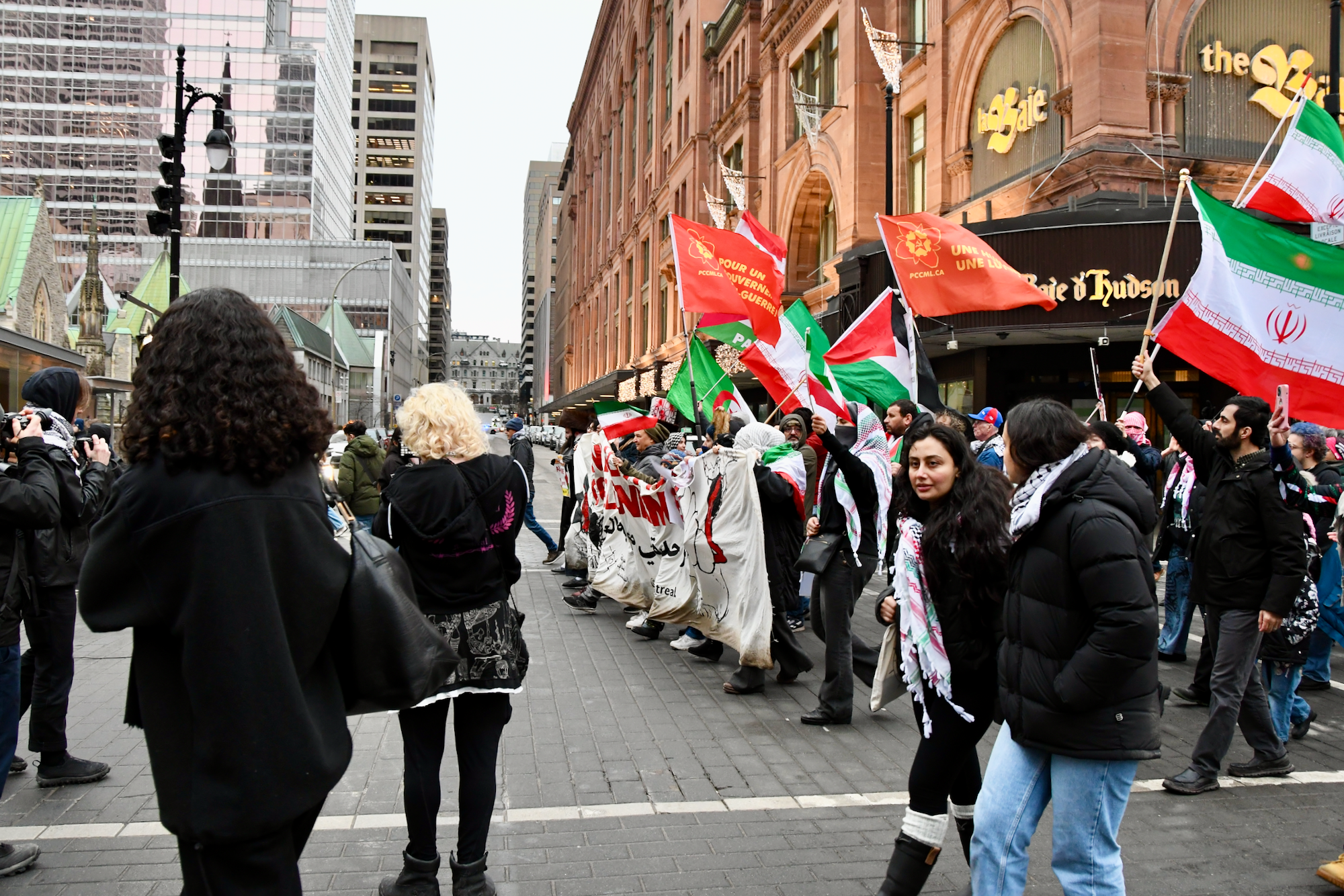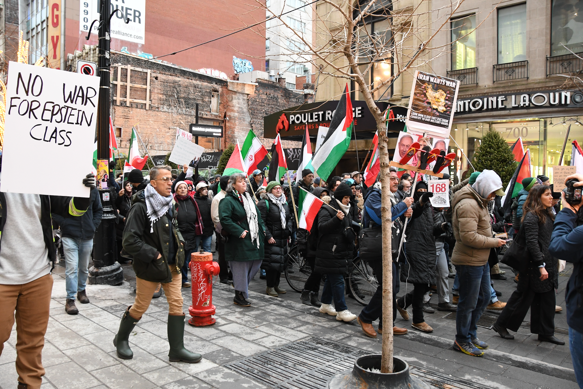 Le 7 mars 2026: rendez-vous à Philips Square devant La Baie pour dénoncer la guerre et l'impérialisme américain, une manifestation organisée par Palestine Youth Movement Montréal et le Iranian Canadian Congress.
