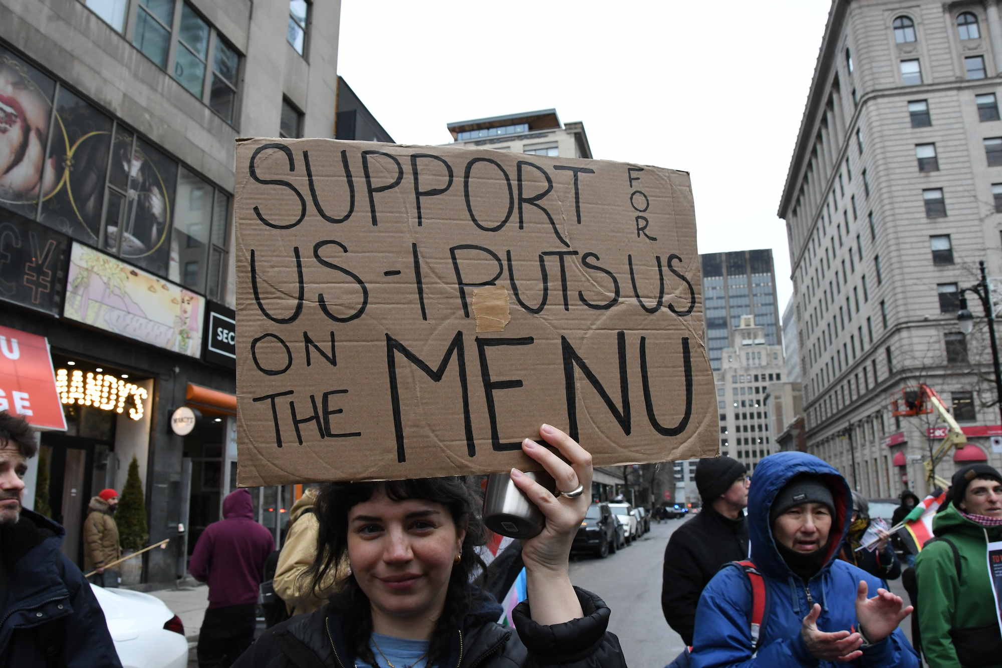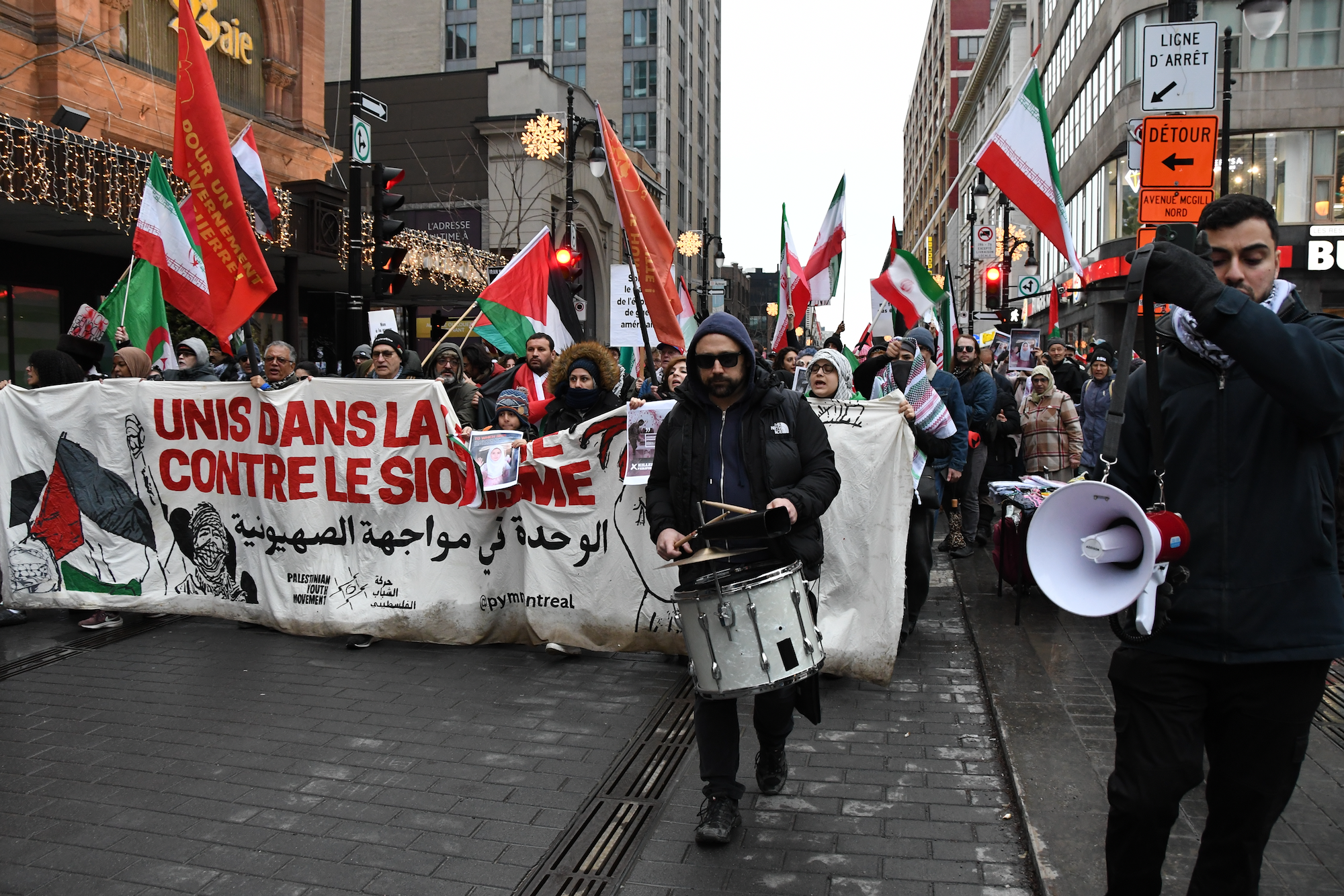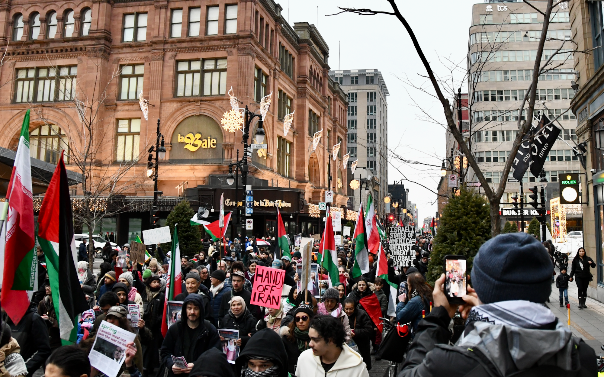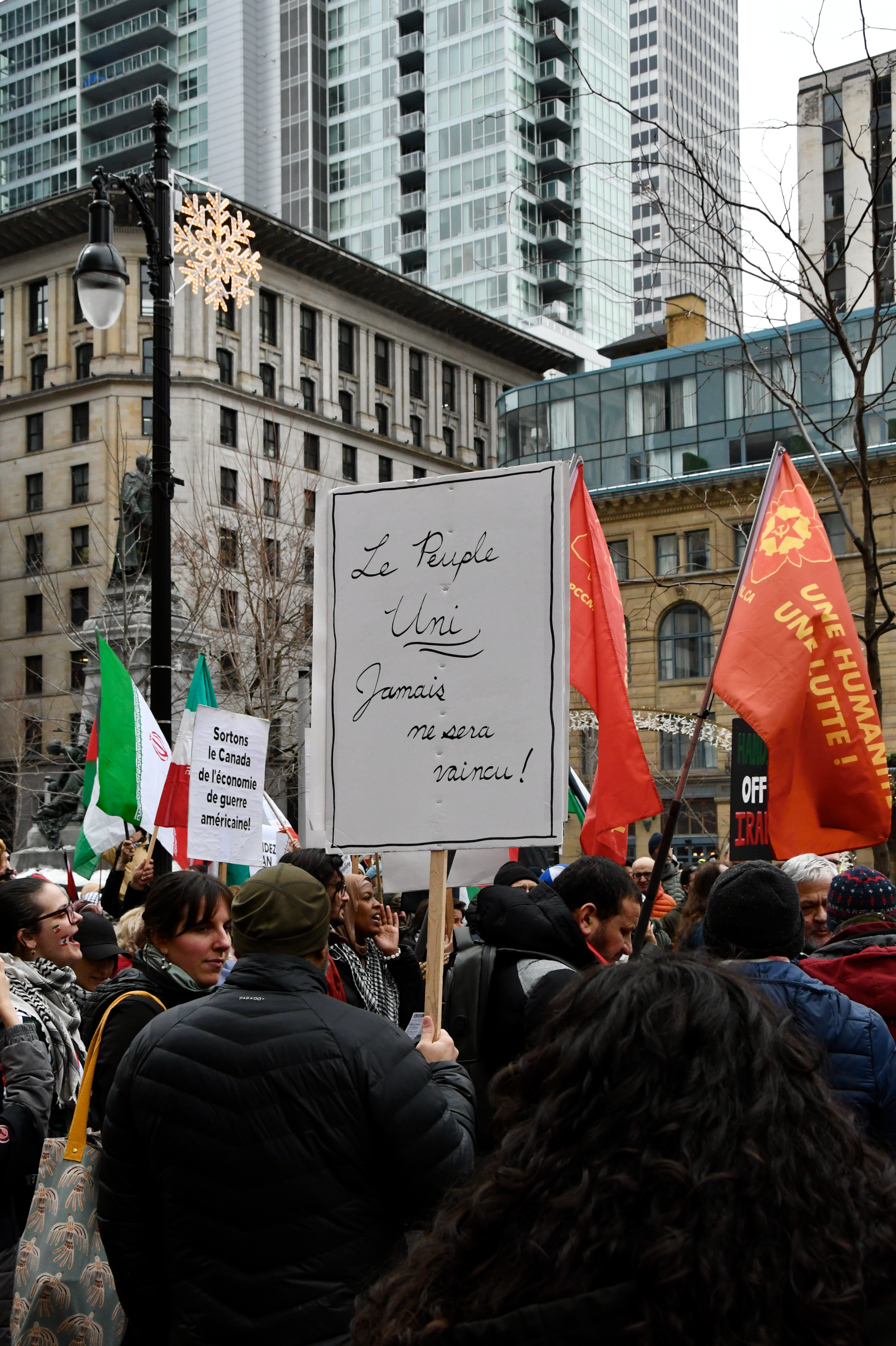 Le 7 mars 2026: rendez-vous à Philips Square devant La Baie pour dénoncer la guerre et l'impérialisme américain, une manifestation organisée par Palestine Youth Movement Montréal et le Iranian Canadian Congress.