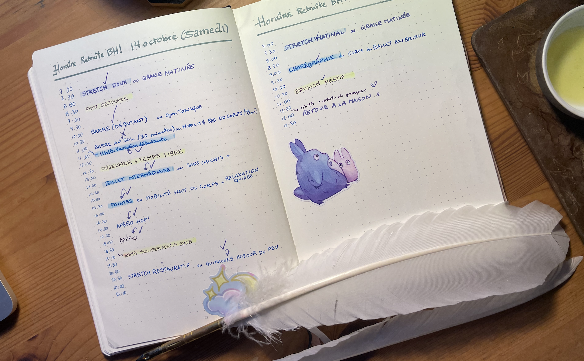 Vendredi 13, une journée magique et chanceuse dans ma famille. J'avais trop hâte, et j'étais une boule de nerfs aussi — la retraite Ballet Hop! serait ma première intensive de danse depuis au moins 2013. En plus, je n'ai jamais fait d'intensive de ballet! Deux de mes profs de danse, Maude et Zoé-Claude, allaient y être, fait très rassurant, mais je ne savais pas exactement à quoi m'attendre. L'indécision la nuit précédente a fait en sorte que j'apportais dans ma valise tous les justaucorps que j'ai trouvés dans ma garde-robe; je ne savais pas si j'allais vouloir passer inaperçue ou m'habiller, comme d'hab, en fée palette pastel fortement tatouée.