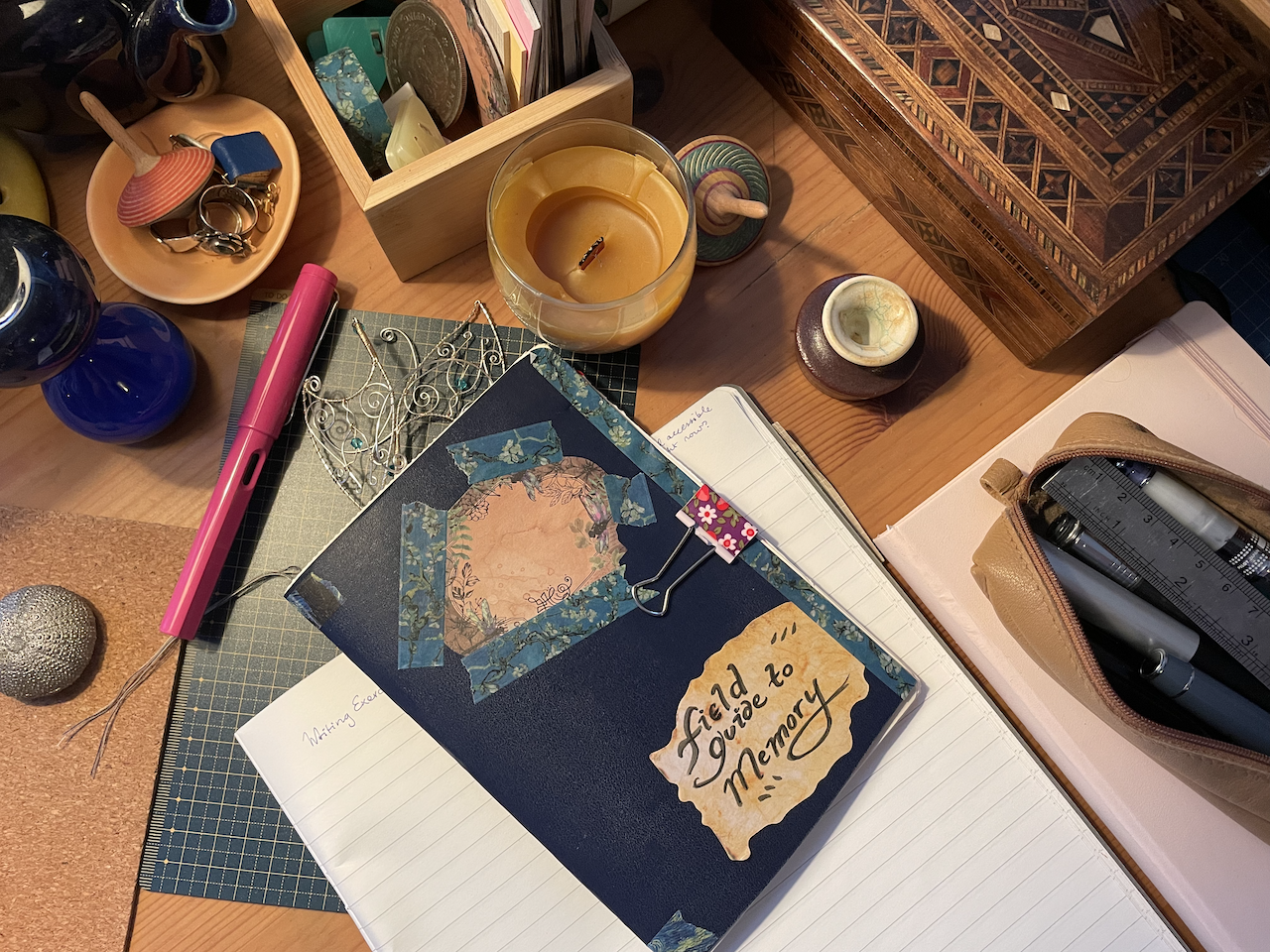 Field Guide to Memory falls into a gaming genre that has several names. The ones I see most often are solo journalling game, solo RPG, or keepsake game, since, through the act of playing the game, the player creates a precious and personal object, a keepsake that serves as a tangible reminder of their experiences. I love this sort of ludonarrative experience: the introspective nature of it, the DIY arts and crafts parts, and of course the writing that remains at the heart of everything. A week ago, I decided that I was going to play Field Guide to Memory every day — or almost, since I managed to do 5 out of 7 days. Each new day in the game consists of a little reading, an imagination and writing exercise, and sometimes a little art/collage activity to decorate the player character's field notes.