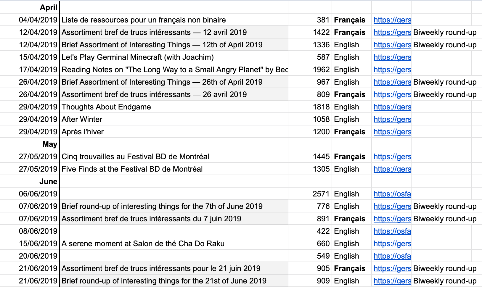 So what the biweekly assortments really forced me to do was get used to spending the effort and time it takes translating everything into the other language. I would experiment writing the draft in either English or French first, to see if I went faster translating in either direction. What I've found is that almost always ends up taking twice as long when I have to translate the blog post.