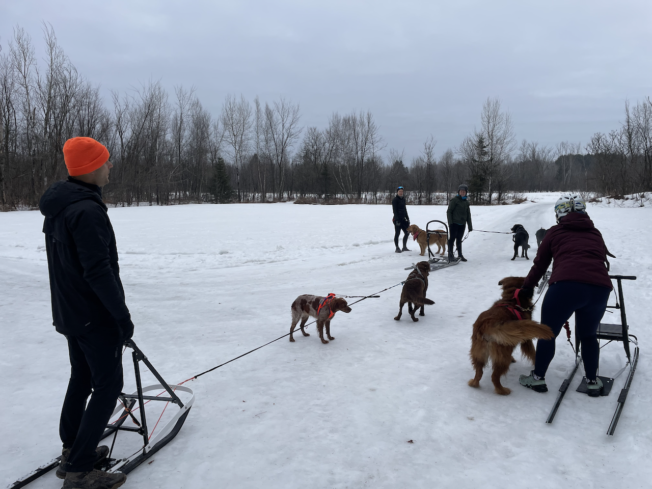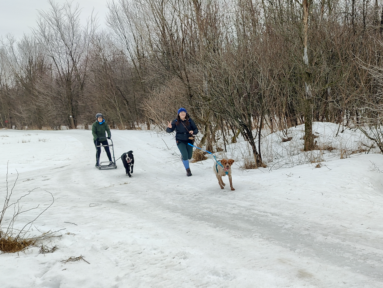 Pippin a trouvé les autres chiens et gens intimidants, puisqu'il y avait beaucoup d'aboiements et d'énergie avant le départ, mais sa timidité a été éventuellement conquise par son amour pour la course—le ti-loup adore courir, et voulait être le plus rapide! La présence des autres équipes canines a produit un effet de « meute » remarquable, Pippin a réussi à courir pendant des kilomètres sans se distraire en suivant son nez. (La seule fois où il a subitement viré hors-piste était quand il a vu un lapin, mais je lui pardonne son enthousiasme, la créature m'a également surprise!)