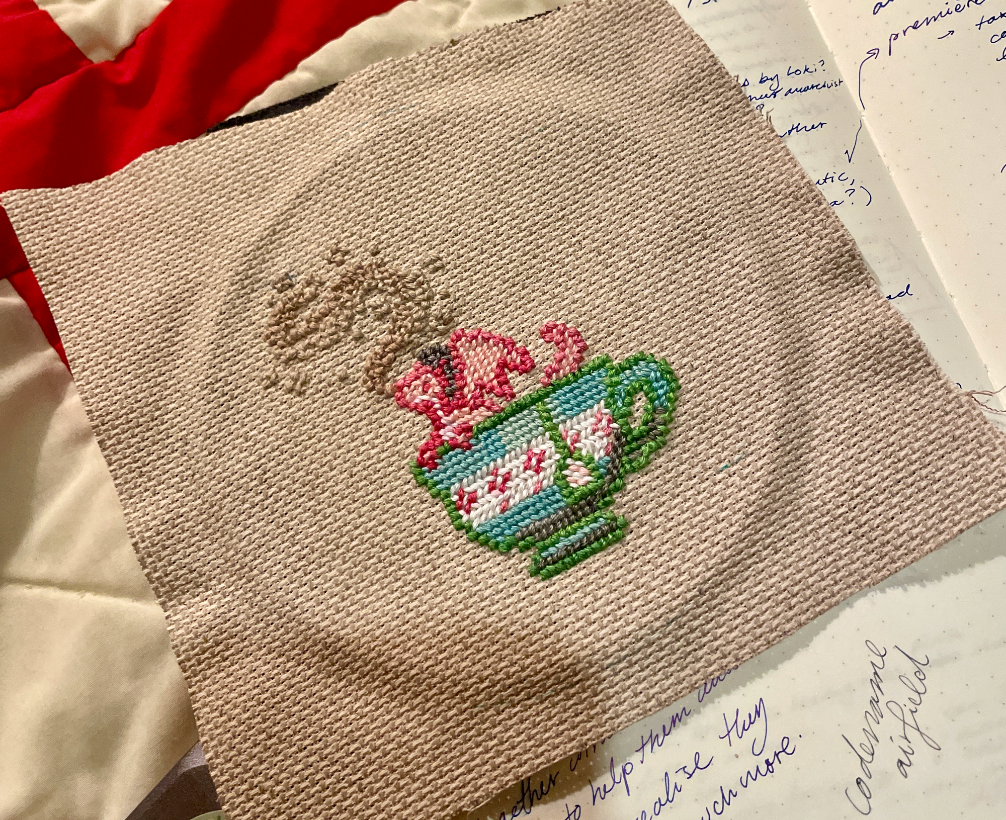 I've never done cross-stitch and I wanted to see if it would be fun. So I picked a cute pattern off of the Internet and went wild. I don't love all my colour choices, but it's not horrible for a first attempt. I'll probably try it again with different colours, soon! The idea is to get good enough at embroidery to do artistic visible mending, à la kintsugi.